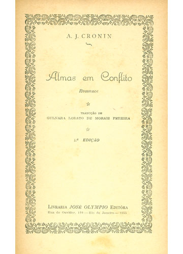 Indice: Constam os volumes: - Algemas partidas - ano 1954 - Os deuses riem - ano 1957 - Almas em conflito - ano 1956 - Anos de tormenta - ano 1954 - Anos de ternura - ano 1954 - A dama dos cravos - ano 1957 - As chaves do reino - ano 1955 - A cidadela - ano 1957 - Sob a luz das estrêlas - ano 1954 - Noites de vigília - ano 1954 - Encontro de amor - ano 1954 - O castelo do homem sem alma - ano 1954 - Pelos caminhos de minha vida - ano 1954 - Uma estranha mulher - ano 1954 - Três amôres - ano 1957